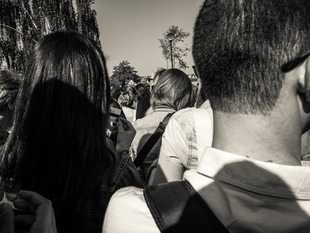 Strasbourg, France - Apr 28, 2019: Rear view of police officers looking at journalists reporting the Yellow Vests protests in Strasbourg a few meters from Council of Europe building black and white