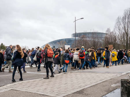 STRASBOURG, FRANCE - MAR 15, 2019: Protesters near European Parliament during demonstrations against climate change global movement Fridays for Future started by Swedish schoolgirl Greta Thunberg