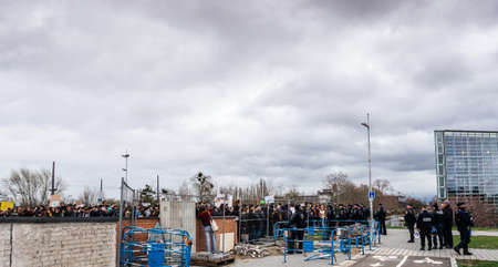 STRASBOURG, FRANCE - MAR 15, 2019: Police securing protesters near European Parliament during demonstrations against climate change global movement Fridays for Future started by Greta Thunberg