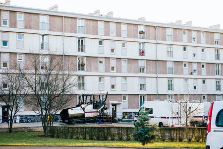 Strasbourg , France - Dec 19, 2016: Asphalt Eurovia pavement machine parked in front of HLM Habitation a Loyer Modere (rent-controlled housing) building
