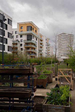 Eco-neighborhood. Close up shot of vegetable gardens in park slippers and buildings behind