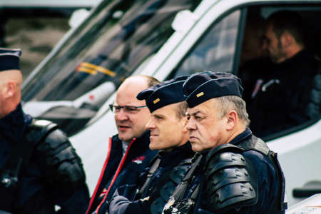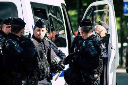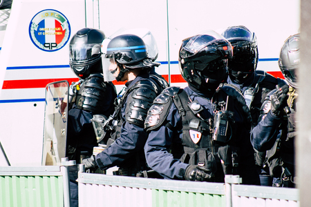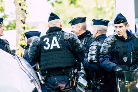 Paris France May 11, 2019 Portrait of a riot squad of the French National Police in intervention during protests of the Yellow Jackets against the policy of President Macron in Paris on saturday afternoon