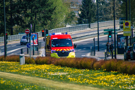 Reims France April 15, 2021 Ambulance driving through the streets of Reims during the outbreak hitting France