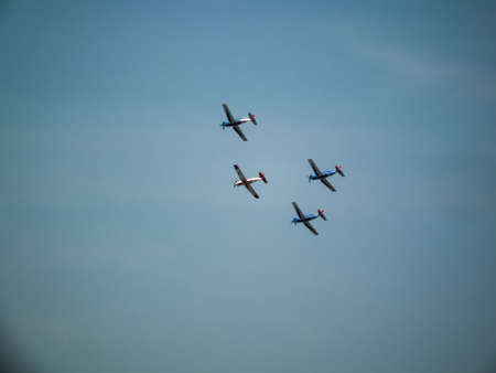 bright blue sky with jet fighter formation flying
