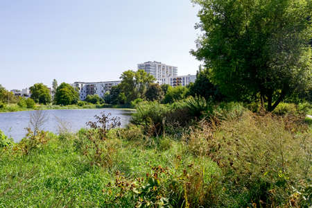 Lake with plants on the shore it is a natural park area the middle of the Goclaw housing district in Warsaw in Poland.