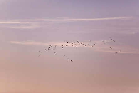 A flock of geese flying in the sky at sunset or sunrise