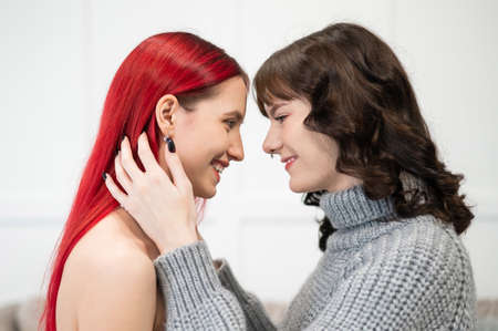 Photo of two beautiful women look at each other in love. Representatives of sexual minority, lesbians. Family relationships in couple
