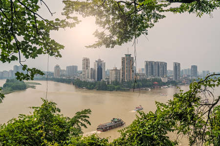 Panoramic summer view of the Leshan town, located at the confluence of the Min River and Dadu River in the southern part of Sichuan province, China