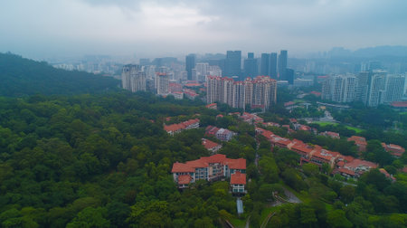 A view reveals traditional buildings surrounded by dense trees in a vibrant city. Skyscrapers loom in the background, creating a striking blend of nature and urban life.