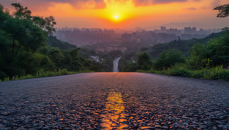 The perspective of the road against the background of sunset and the cityscape