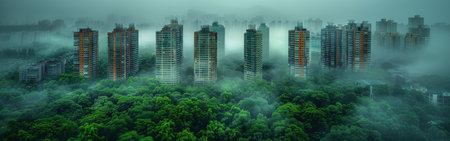 A panoramic view of a dense forest, shrouded in a thick layer of fog. Several tall apartment buildings rise through the fog, showing the contrast between nature and urban development. The buildings appear as islands in a sea of green, hinting at the encroachment of civilization into natural landscapes.