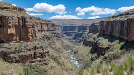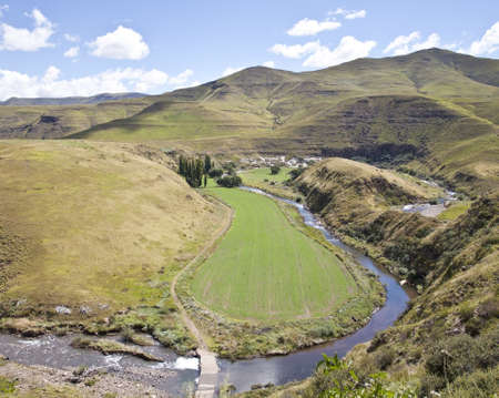 Mountains valley river overlooking horizon landscape Sani-Pass Drakensberg South-Africa.