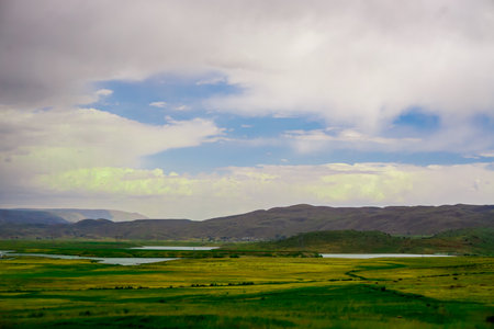 Mongolian steppe under a blue sky with white clouds