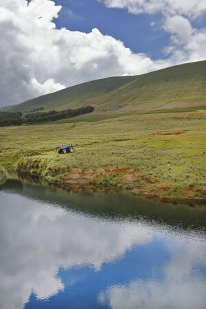 Beautiful landscape of green hills and lake in the mountains under cloudy sky