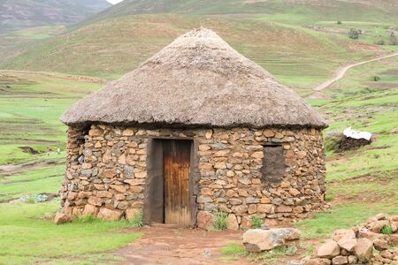 traditional stone bungalow with straw roof without people at Semonkong village and it's waterfall and Morija and it's Dinosaur footprints, Lesotho