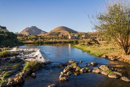 Landscape with road and rock formation in central Madagascar on a sunny day
