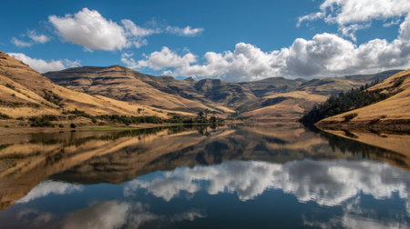A peaceful lake reflects the surrounding hills and clouds under a clear sky during early morning, creating a serene and picturesque nature scene.