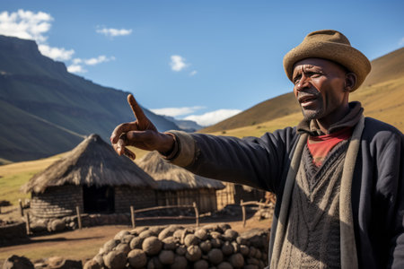 BLACK MOUNTAIN PASS, LESOTHO - MARCH 24, 2018: Unidentified Basotho people in traditional clothes in the Mamokae village. A donkey is visible
