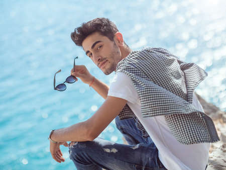 Traveler on the rocks near the sea looking at camera. Summer Travel Vacation. Smiling handsome young caucasian tourist man in casual clothes outdoors on the nature.