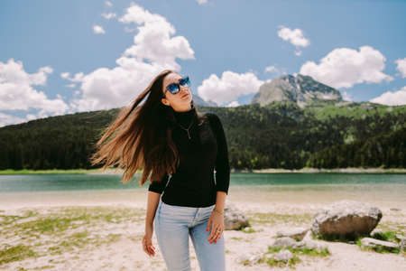 attractive woman relax in countryside with lake view on vacations