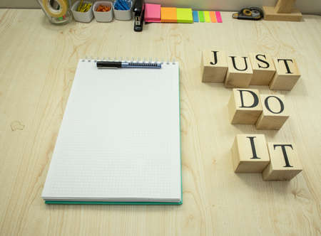 There is a notepad checker and pencil on the table. On the right, it says, Just do it, with a wooden cube. Studio was photographed.