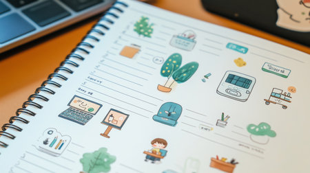 A colorful planner open on a desk with doodles, a laptop, and stationery in a cozy workspace