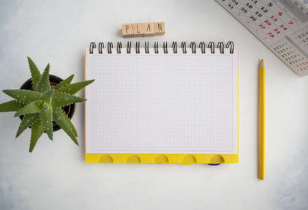 Workspace at home, notepad, cactus, calendar on a white background. Place for your text.