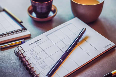 Computer laptop on top of calendar planner and blue tabletop. Business planning concept.