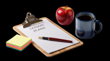 Desk scene with notepad, sticky labels, and open planner under soft lighting