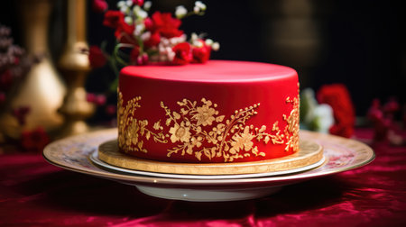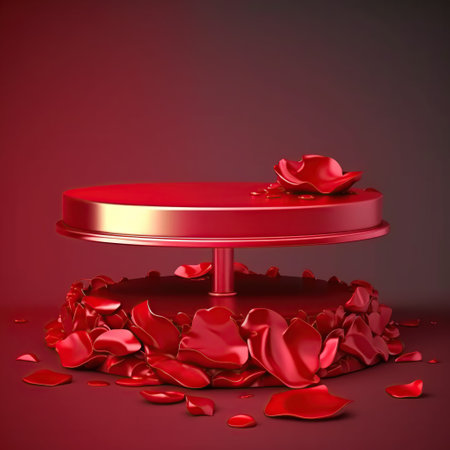3d render of red podium with rose petals on red background