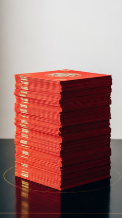 Close-up of a substantial pile of unlit, decorative red and gold firecracker wrappings placed on a d