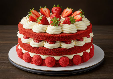 A beautifully decorated two-layer red velvet cake adorned with whipped cream, fresh strawberries, and raspberries on a white cake stand.