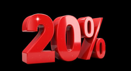 A glossy, three-dimensional red number 20 with a percent sign, isolated on a stark black background.