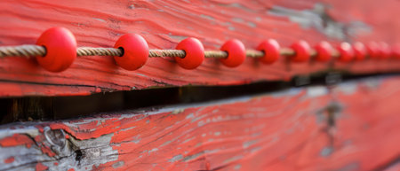 A close-up of a wooden boat with red buoys strung across the side. The boat is weathered and has red paint that is peeling off. The buoys are spaced evenly apart.