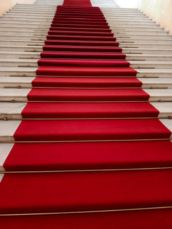 Long red carpet covers wide marble staircase in classic architectural style, shot from below angle, symbolizing luxury and prestige..