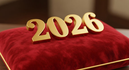 a red velvet pillow with '2026' on it. 3D rendering.