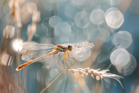 Dragonfly on a branch plant in a sunbeam. Sunset