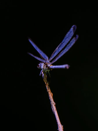 Blue damselfly at night, backlit with a big white light which looks like the moon