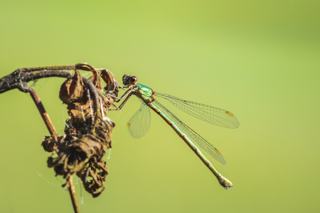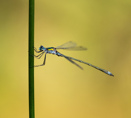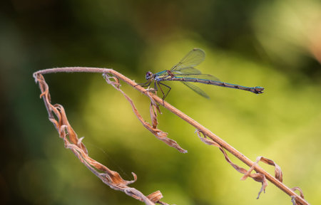 Lestes dryas emerald spreadwing scarce emerald damselfly and robust spreadwin lovely blue-eyed insect perched on a stick natural light