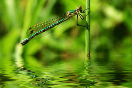 An Emerald Damselfly gripping onto a grass reed at the edge of a pond in a nature reserve in Cornwall, UK