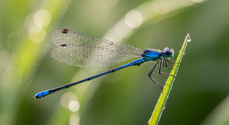 A macro shot of a blue damselfly perched on a blade of grass, with its delicate wings and large eyes in sharp focus.