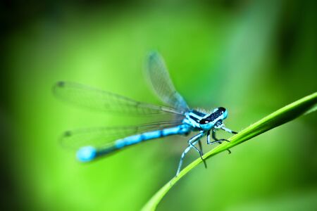 A blue dragonfly is sitting on a green leaf. The dragonfly is the main focus of the image, and the green leaf provides a contrasting background. Concept of tranquility and harmony