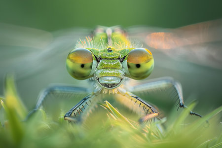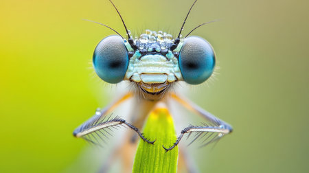 Frontal close-up of a Feather Dragonfly (Platycnemis) looking at the camera. You can clearly see the compound eyes and the little hairs on the face. The background is green with space for text.