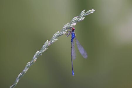 Dragonfly sitting on a dry stick, wildlife. A thin blue dragonfly sits on a narrow leaf of grass. Out of focus.