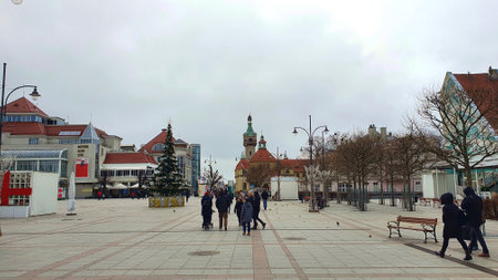 Sopot, Poland - January 3, 2021: Dom Zdrojowy - market at Monte Cassino street in Sopot. People walking on the street.