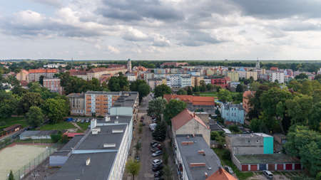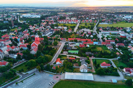 Scenic aerial view of historical center of Polish town of Kalisz at sunset in spring, Greater Poland Voivodeship