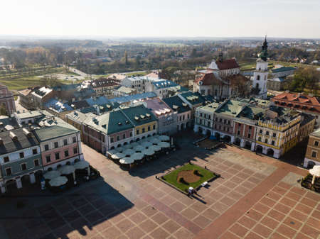 ZAMOSC, POLAND - NOVEMBER 01 2019: Aerial to main Town Hall at great market Square Rynek Wielki in Zamosc at sunny day