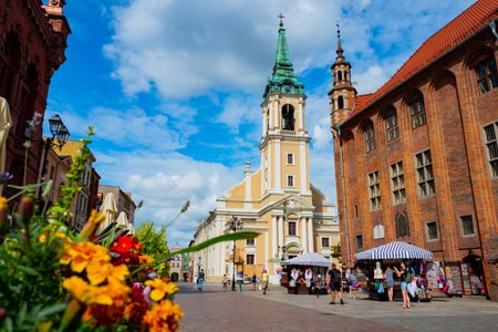 06-07-2022: Fascinating facades in Old Town. Restaurant gardens in Torun Old Town. Florists in the market. Old architecture in city Torun, Poland.