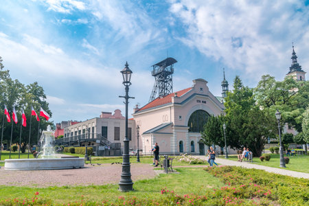 Wieliczka, Poland - July 27, 2019: Kościuszko Square with Wieliczka Salt Mine - Regis Shaft in background.
