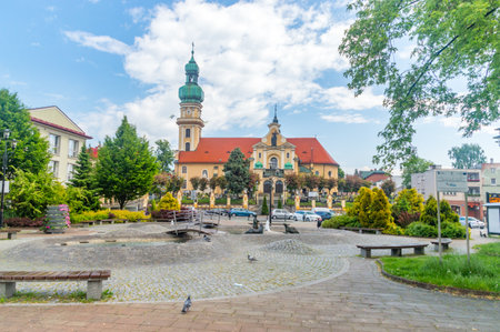 Tychy, Poland - June 5, 2021: Market square with fountain with Otters and St. Mary Magdalene church in background.
